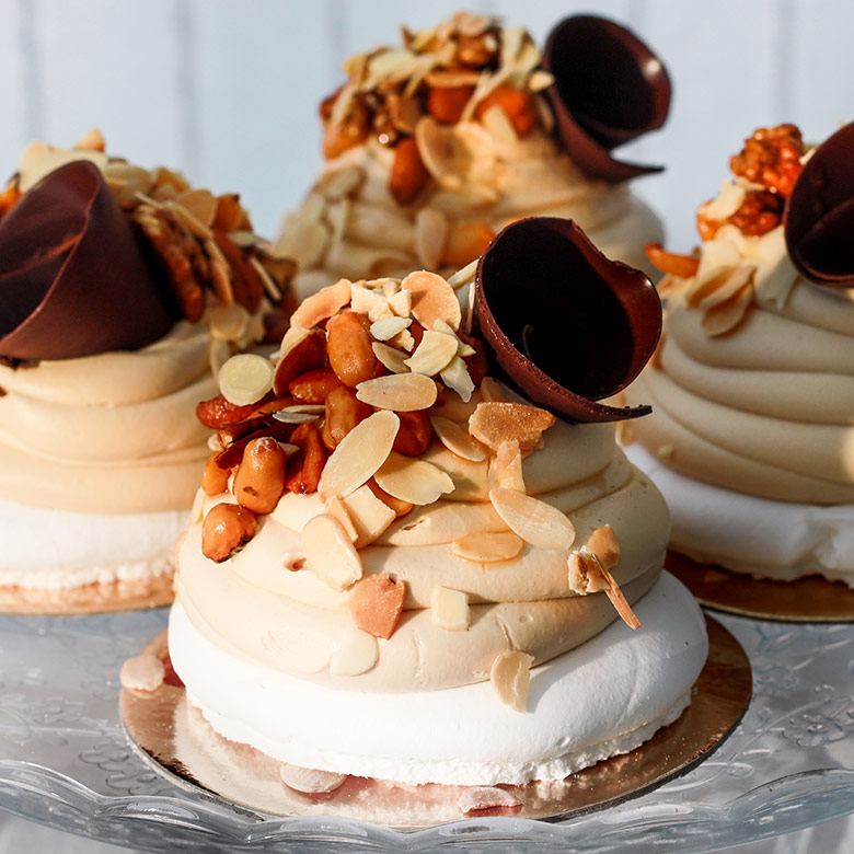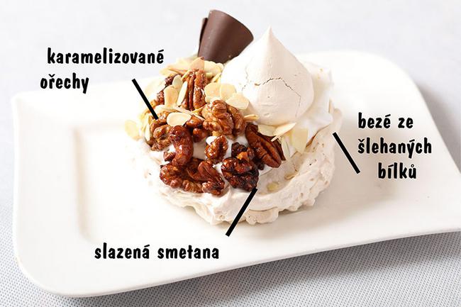 Kombinace sněhových bílků, slazené smetany a karamelizovaných ořechů je další oblíbená verze dezertu Pavlova.