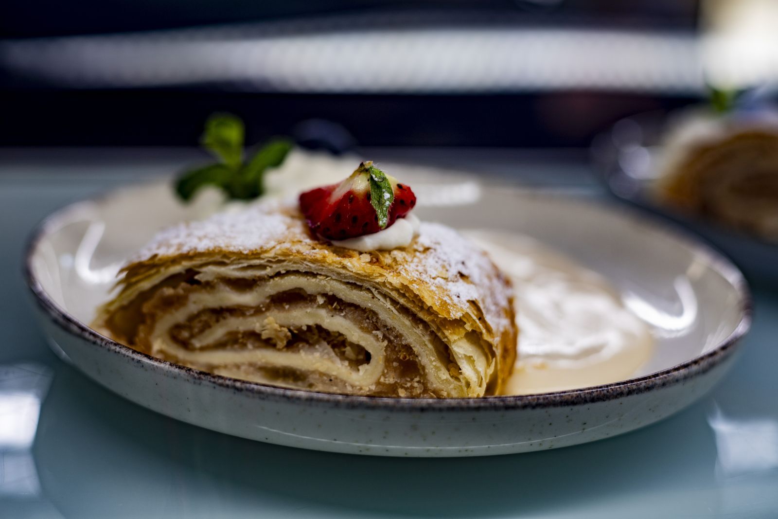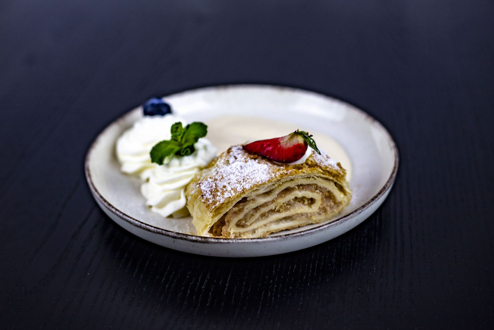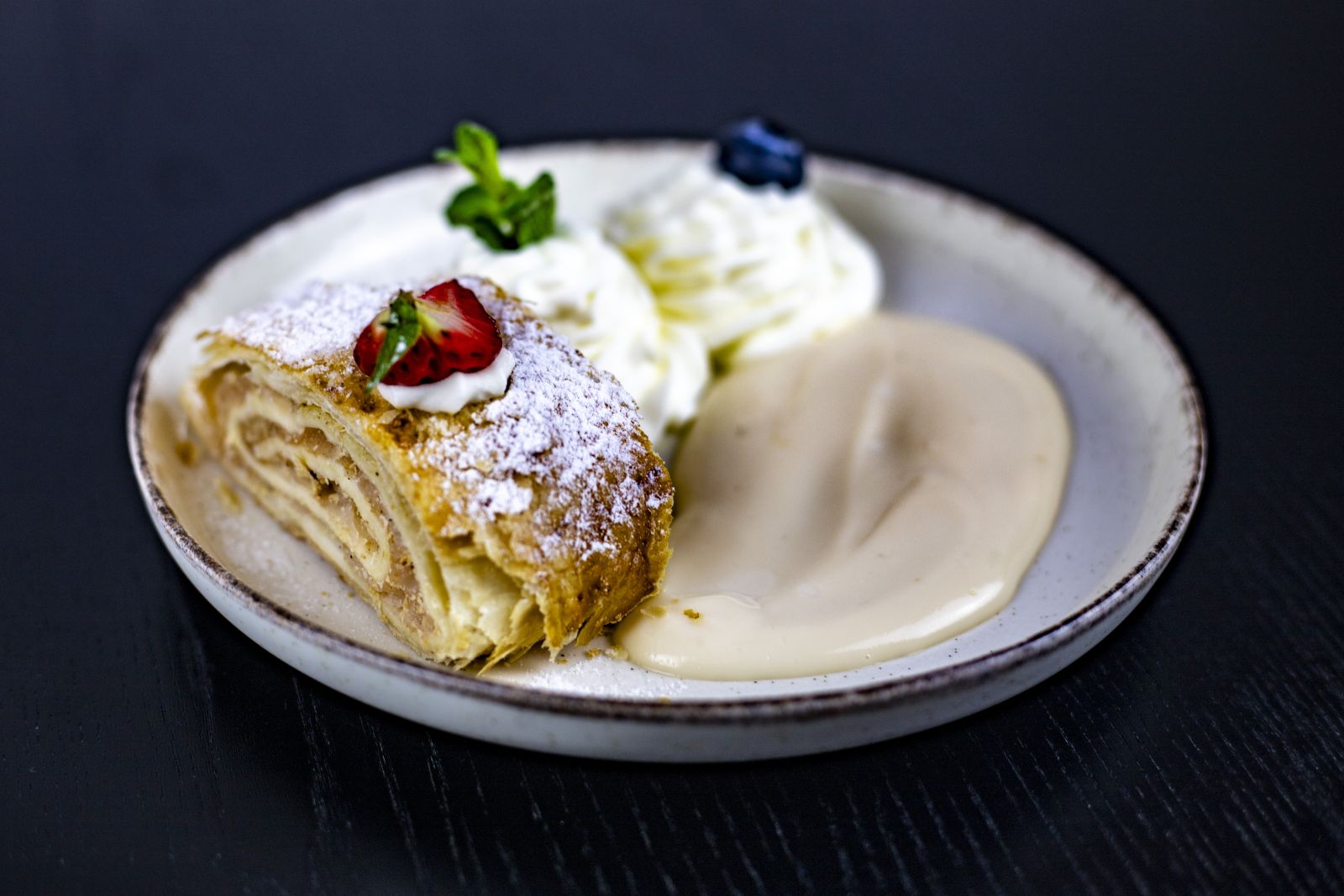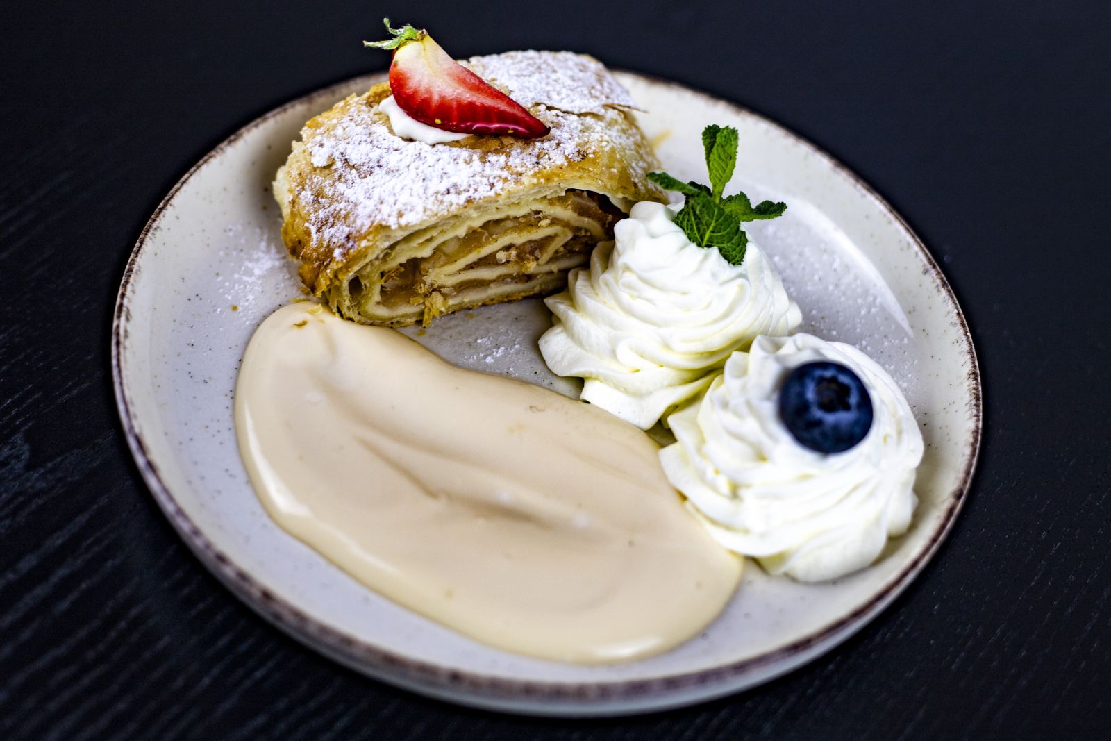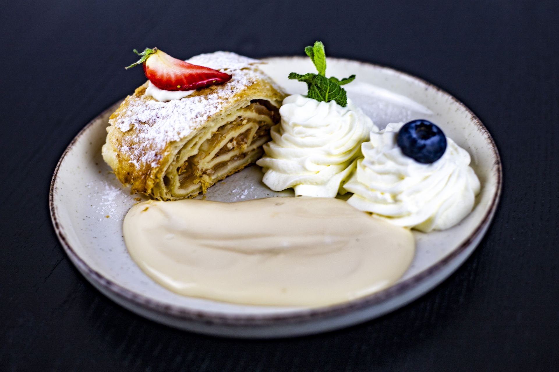 Jablečný štrůdl s vanilkovou omáčkou a šlehačkou
