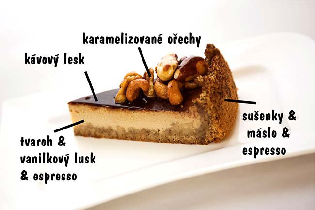Pečená lahodná směs slazeného tvarohu, pravé vanilky a silného espressa vylitá do ráfku z mačkaných máslových sušenek a vlašských ořechů, zdobeno zkaramelizovanými ořechy.