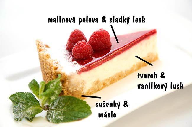 Pečená lahodná směs slazeného tvarohu a pravé vanilky vylitá do ráfku z mačkaných máslových sušenek, doplněná intenzivní vrstvou mixovaných malin, zdobeno čerstvým ovocem.