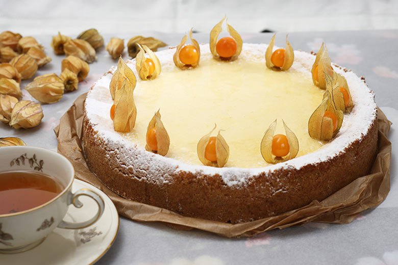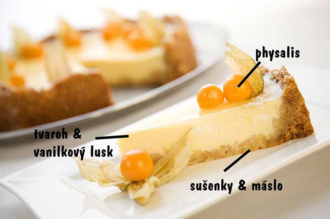 Pečená lahodná směs slazeného tvarohu a pravé vanilky vylitá do ráfku z mačkaných máslových sušenek, bohatě zdobeno physalisem.