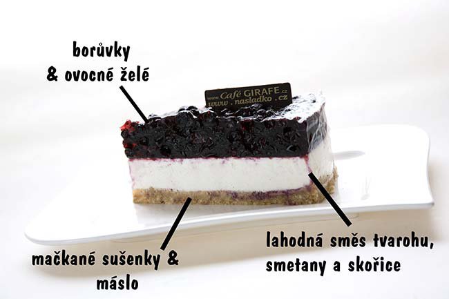 Směs šlehačky a tvarohu s minimem cukru vylitá do ráfku na mačkané máslové sušenky s bohatou dávkou borůvek.