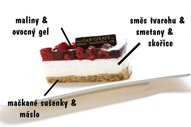 Směs šlehačky a tvarohu s minimem cukru vylitá do ráfku na mačkané máslové sušenky s bohatou dávkou malin.