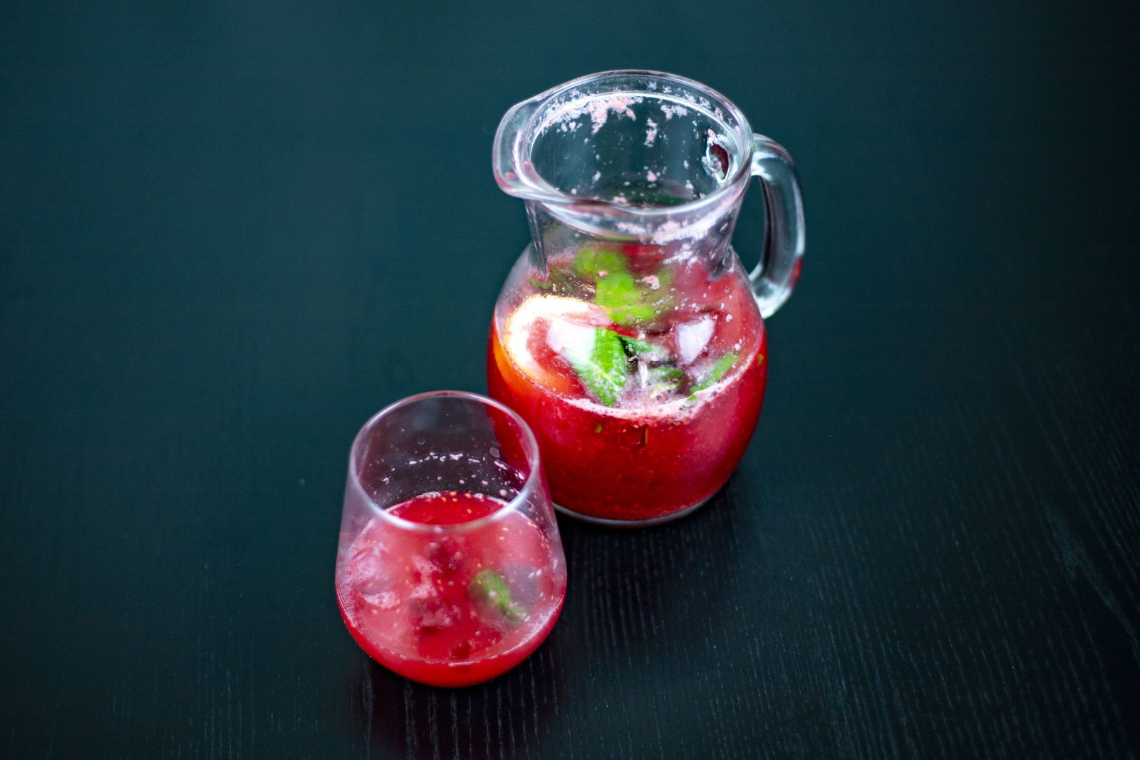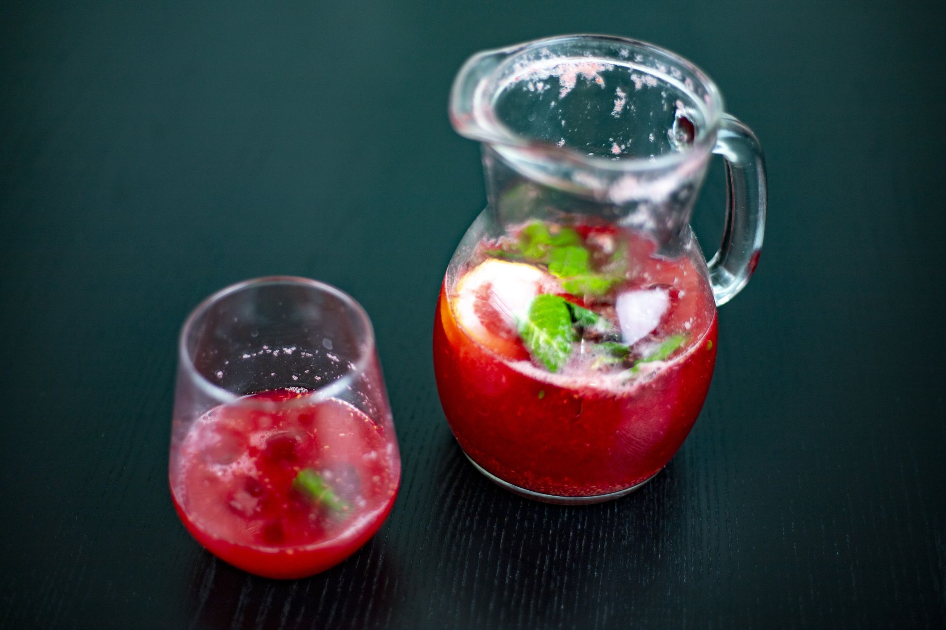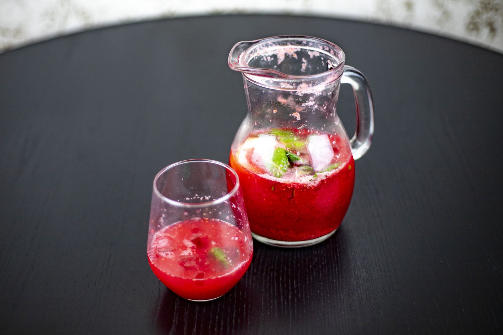 dřbánek malinové limonády s kousky ovoce, ledem a lístky máty